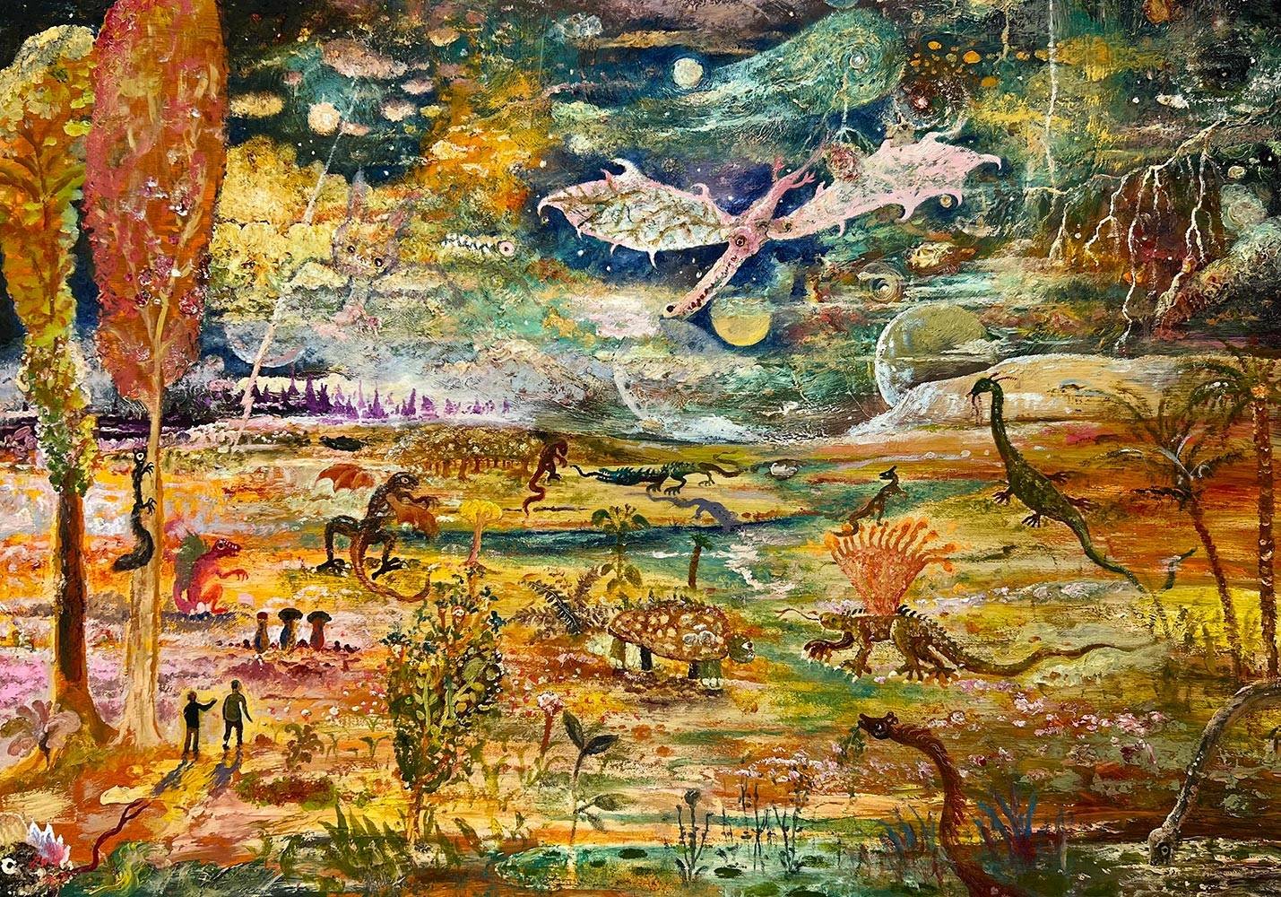 The exhibition features around fifty paintings, ranging widely in scale and price, from intimate works on paper to large-scale canvases. Each artist explores a distinct relationship with the material and symbolic life of colour: Tim Millen’s creaturely forms navigate a dissolving natural order; Elizabeth Cope’s new and past works form a vibrant continuum of struggle and renewal; and Budi Gugi’s poetic paintings balance solitude, joy, and sorrow through a meditative use of light and tone. Peter Burns’ vivid narratives blend myth and humour in charged compositions, while Nuala Clarke’s atmospheric abstractions evoke the sensory experience of place and memory.